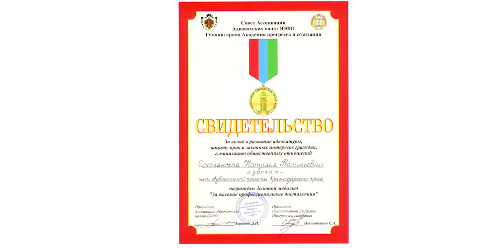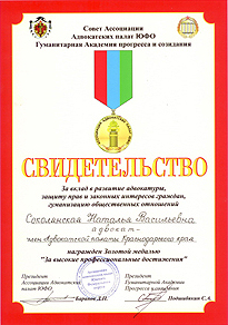 в 2010 году Золотой медалью АССОЦИАЦИИ АДВОКАТСКИХ ПАЛАТ ЮЖНОГО ФЕДЕРАЛЬНОГО ОКРУГА «За высокие профессиональные достижения»