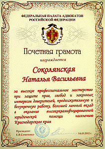 в 2012 году Почетной грамотой ФЕДЕРАЛЬНОЙ ПАЛАТЫ АДВОКАТОВ РОССИЙСКОЙ ФЕДЕРАЦИИ