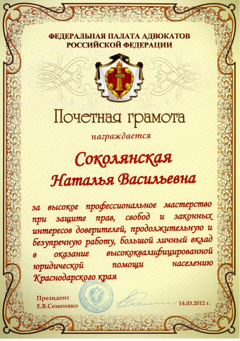 Добро пожаловать на официальный сайт адвоката Краснодарской краевой коллегии адвокатов адвокатской палаты Краснодарского края Соколянской Натальи Васильевны!