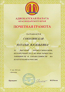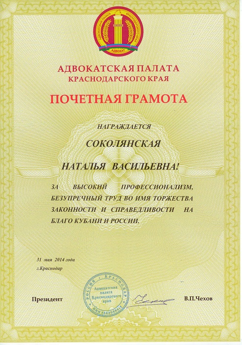в 2014 году Почетной грамотой АДВОКАТСКОЙ ПАЛАТЫ КРАСНОДАРСКОГО КРАЯ