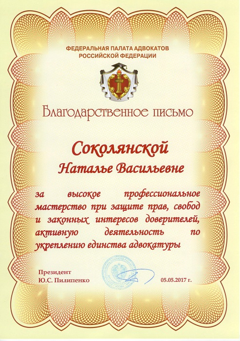 в 2017 году Благодарственным письмом ФЕДЕРАЛЬНОЙ ПАЛАТЫ АДВОКАТОВ РОССИЙСКОЙ ФЕДЕРАЦИИ